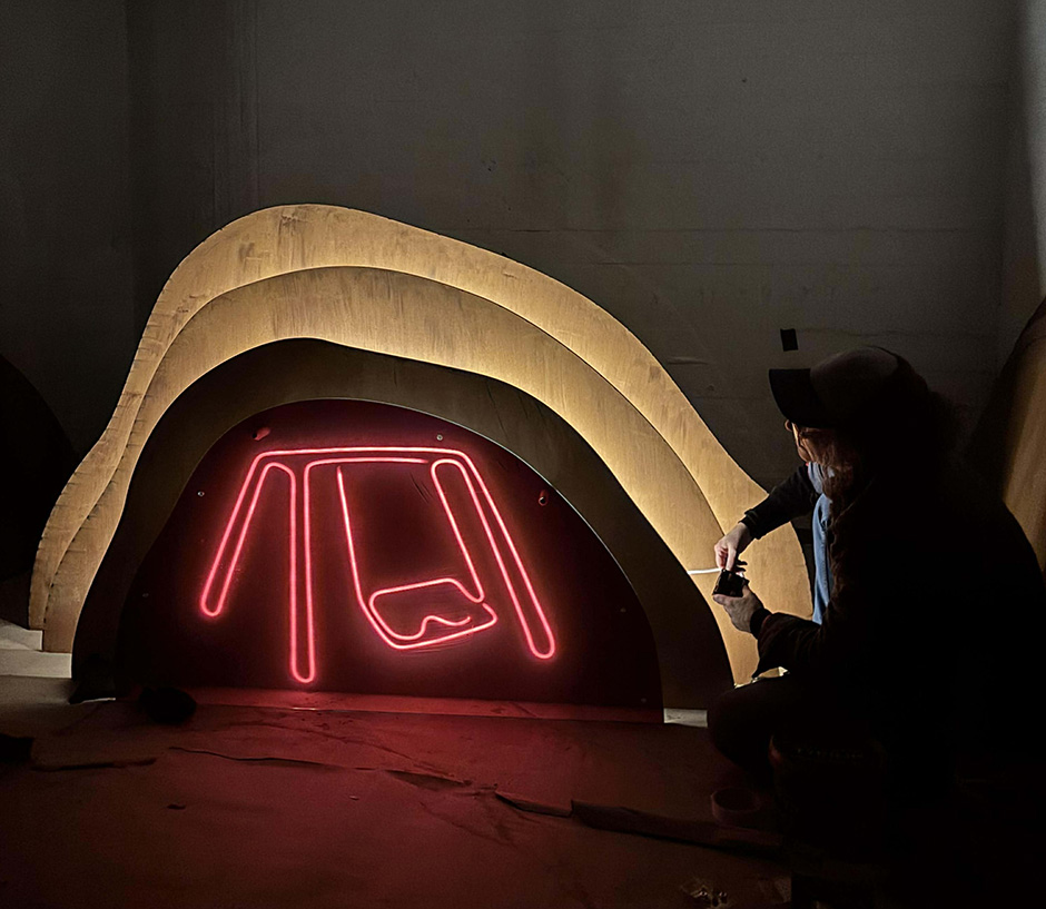 Bejdsede MDF-plader, akryl, farvede folier og LED-bånd.